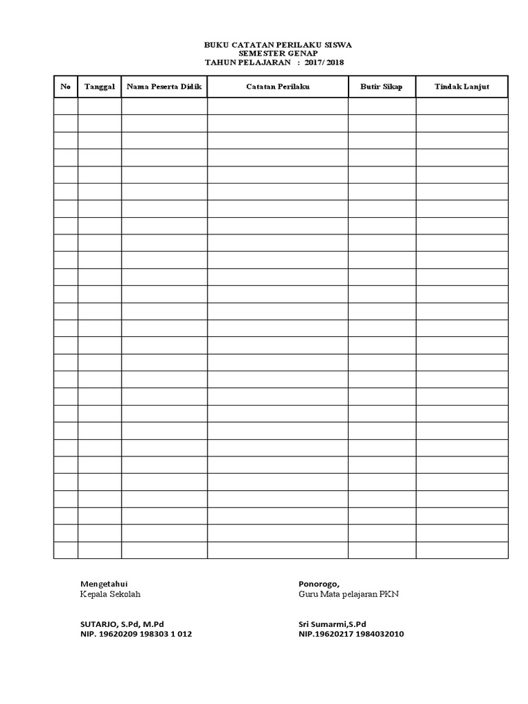 Buku Catatan Perilaku Siswa Semester Genap Tahun Pelajaran 2017 2018 No Tanggal Nama Peserta Didik Catatan Perilaku Butir Sikap Tindak Lanjut