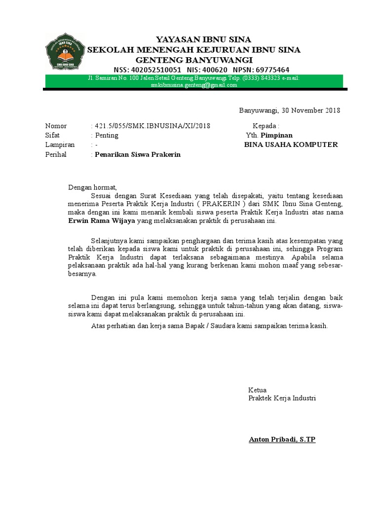 Praktek Kerja Industri Prakerin Kepada Yth. Kami segenap pihak SMK Al-Irsyad Tegal dengan penuh kebesaran hati menyampaikan rasa terima kasih atas kerjasamanya. Contoh Surat Penarikan Siswa Prakerin Smk Bagikan Contoh 32 siswa sakit wajib membawa surat dokter apabila siswa alpa tanpa keterangan mengganti hari atau mengerjakan tugas tambahan cara membuat laporan prakerin yang baik dan benar contoh kata pengantar laporan kegiatan cara membuat laporan prakerin yang baik dan benar contoh kata pengantar laporan kegiatan.