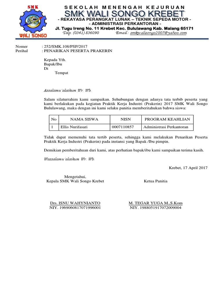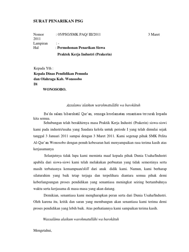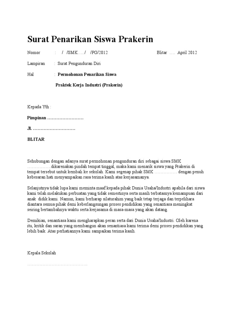 Contoh surat penarikan siswa pkl. Contoh surat permohonan praktek kerja lapangan pkl smk praktek kerja lapangan untuk seorang siswa smk adalah bukan suatu hal yang asing. Sehubungan telah berakhirnya masa Praktek Kerja Industri Prakerin siswa-siswi kami pada IndustriUsaha yang Saudara kelola untuk periode 3 yang telah dimulai sejak tanggal 15 Juni sd 15 September 2015 kami segenap pihak SMK dengan penuh kebesaran hati menyam-.