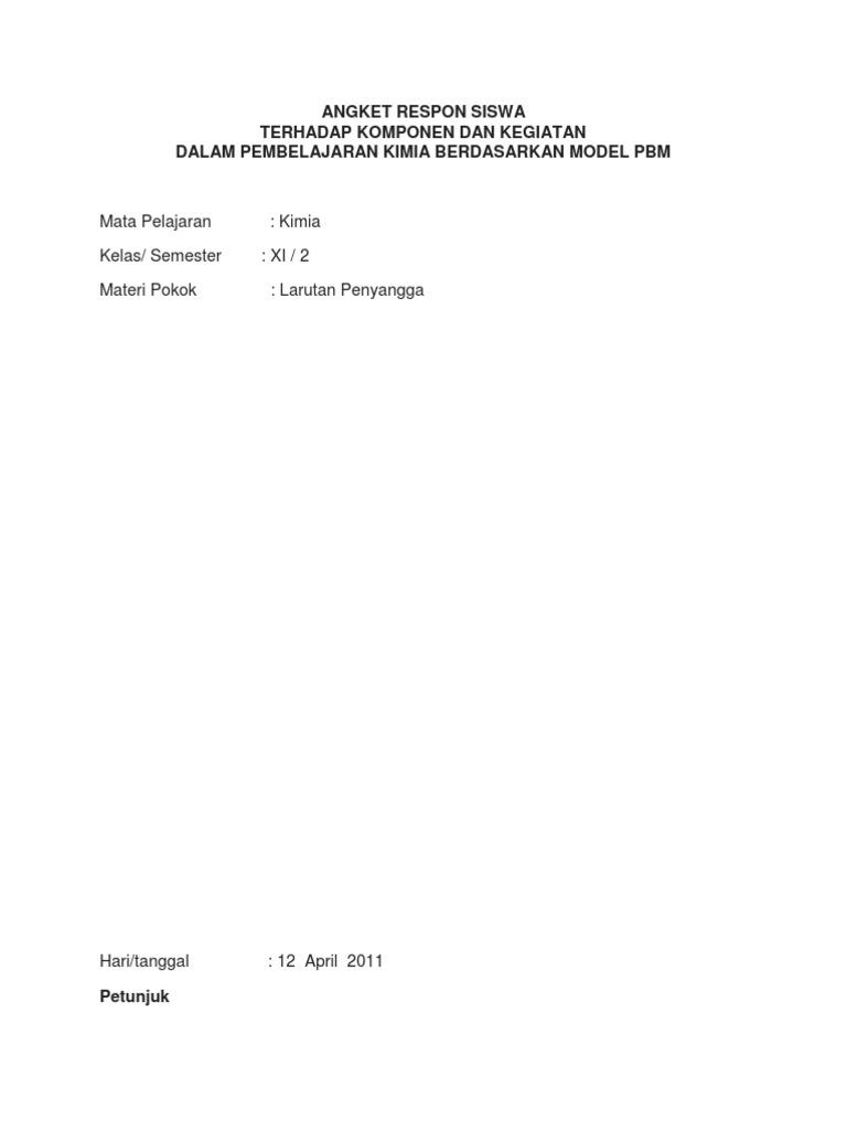 Diberikan angket untuk mengetahui respon siswa terhadap model Pembelajaran Berbasis Masalah serta wawancara dengan guru yang. Skripsi Jurusan Kimia Fakultas Matematika dan Ilmu Pengetahuan Alam Universitas Negeri Semarang. Perancangan instrumen observasi keterampilan berpikir kreatif angket respon siswa.
