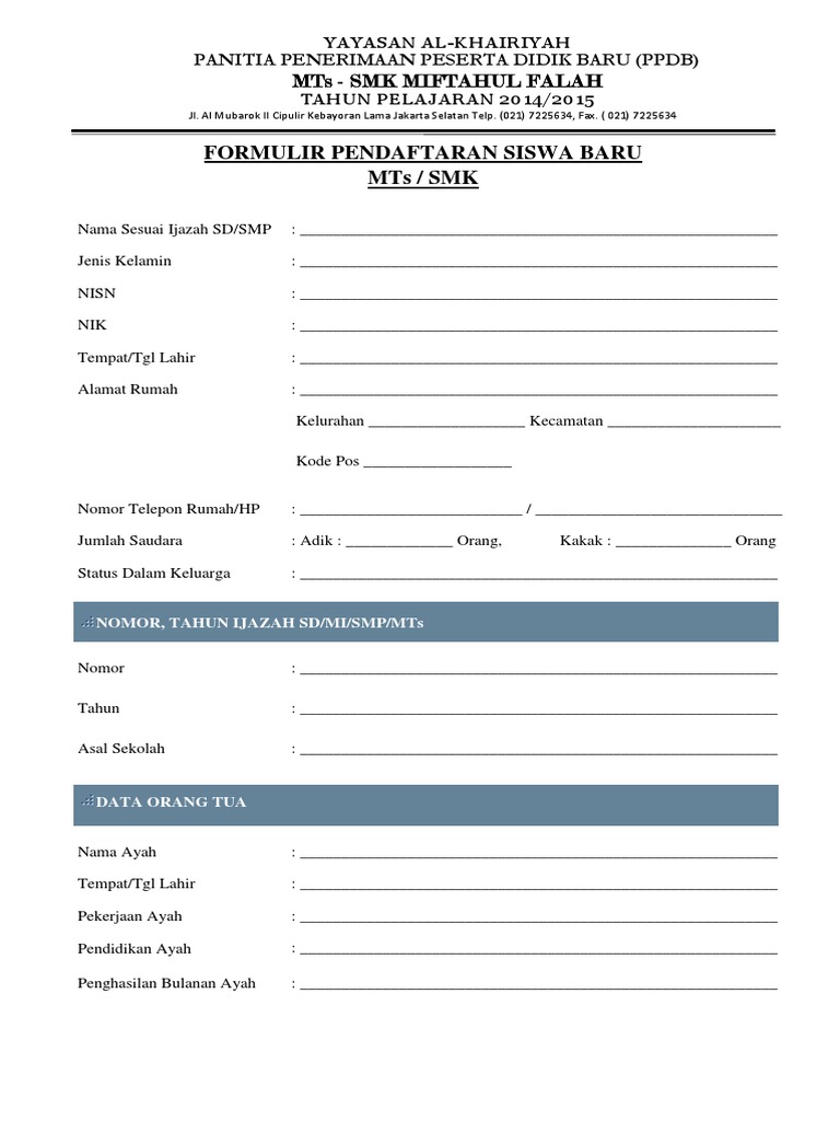 Formulir Pendaftaran Siswa Baru Smk Doc